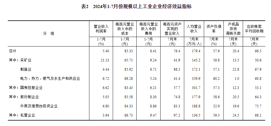 7月末,规模以上工业企业每百元资产实现的营业收入为76.4元,同比减少2.3元;人均营业收入为179.4万元,同比增加7.8万元;产成品存货周转天数为20.4天,同比增加0.2天;应收账款平均回收期为66.5天,同比增加3.4天。