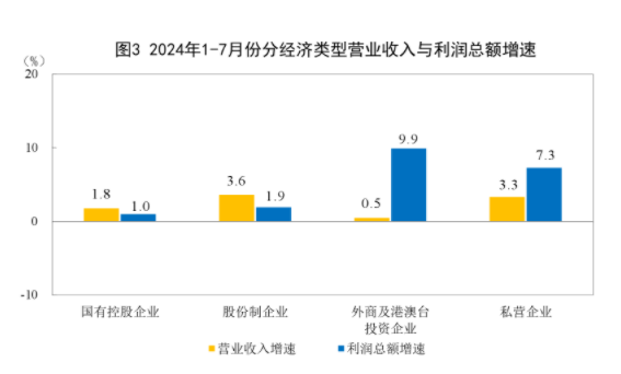 1—7月份,规模以上工业企业中,国有控股企业实现利润总额13917.3亿元,同比增长1.0%;股份制企业实现利润总额30514.6亿元,增长1.9%;外商及港澳台投资企业实现利润总额10184.9亿元,增长9.9%;私营企业实现利润总额11031.0亿元,增长7.3%。