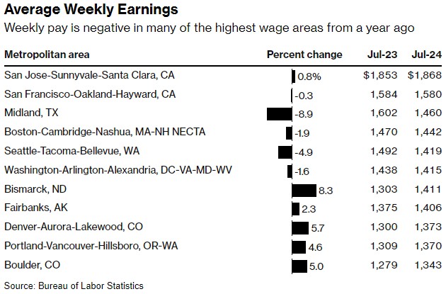 不过,新发布的数据中可能令人惊讶的一个因素在于,公司盈利普遍缩水。数据显示,2024年7月,43%的大都市地区的平均周薪低于去年同期。