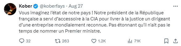 而在鸭鸣报的X账号下方,很多网友也表达了对这种政治陷阱的愤怒。有网友讽刺称,法国总统曾作为中央情报局的助手将一家全球知名公司的董事绳之以法,现在又忙于这种阴谋事件,怪不得没时间任命总理。