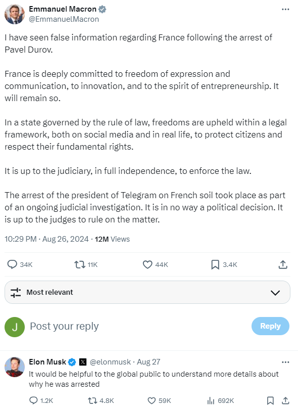 马克龙则亲身在X上辟谣称,在Durov被捕后,有关于法国的虚假信息不断传播。他还表示,所谓的“法国出于政治动机逮捕Durov”的说法完全违背现实,法国致力于维护言论和交流的自由,逮捕Durov是法国司法调查的一部分。