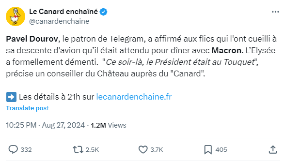 周三的最新刊物中,鸭鸣报称,上周六Durov被捕时就向法国警方通报了与马克龙的会面计划。而这一报道在法国引发了强烈的反应,有人愤慨表示这是马克龙的无耻圈套。