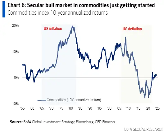 美银表示,“债务、赤字、人口结构、逆全球化、人工智能和净零政策都将导致通胀”,大宗商品的年化回报率可能达到11%。