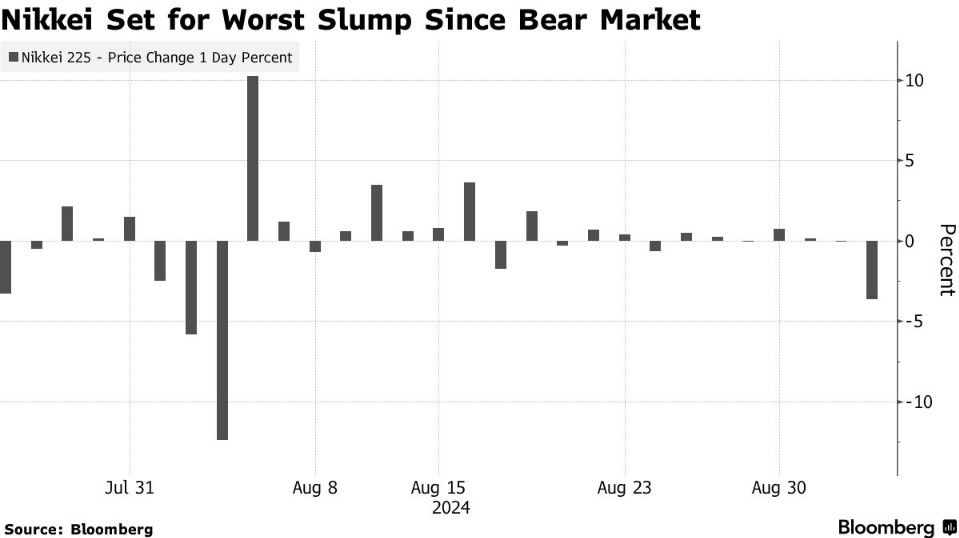 美国制造业数据表现疲软,加剧了市场对全球最大经济体的担忧。隔夜美股市场因此承压,特别是芯片股遭受重创,其中英伟达股价大幅下跌9.5%,带动整个芯片板块下跌。这一跌势也波及亚太股市,周三早盘亚太地区股市普遍大跌。其中,日本股市的基准指数遭遇了自8月5日以来的最大跌幅,与此同时,日元的走强给出口商带来了额外压力。韩国股市的情况也类似,其基准指数Kospi在早盘一度下跌3%,创下8月5日股市崩盘以来的最大跌幅。