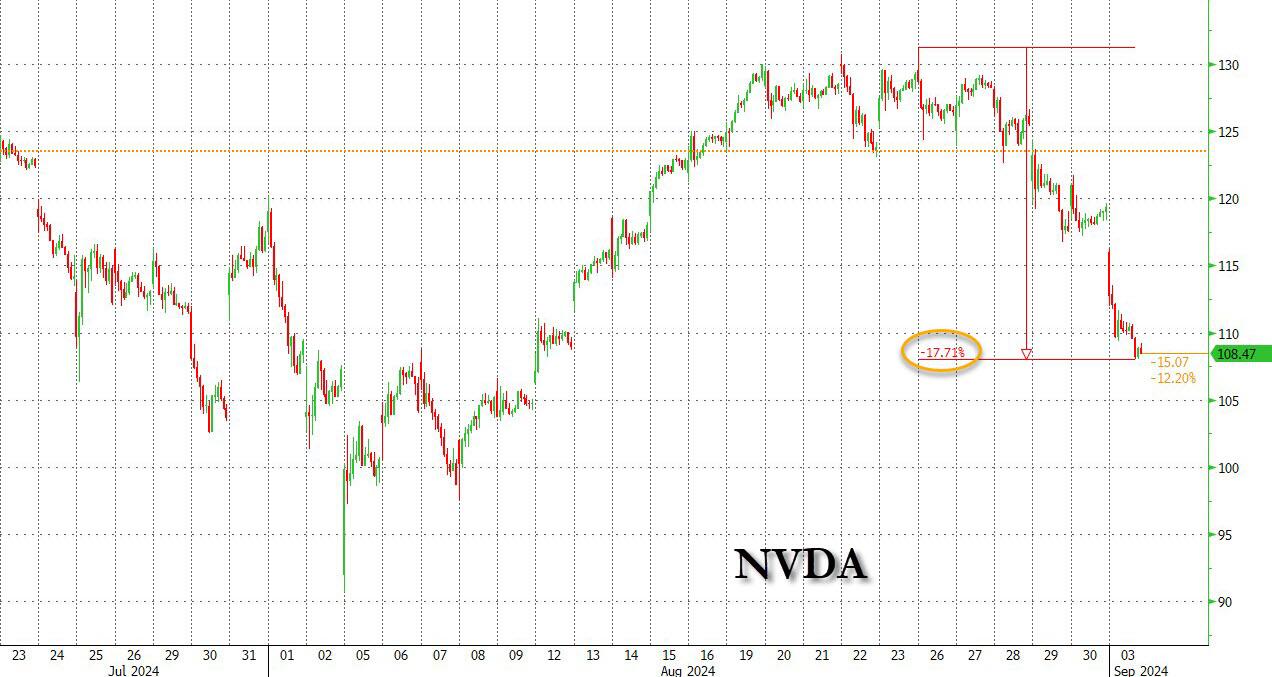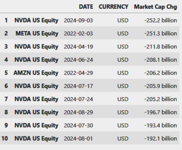 在年内引领市场的科技巨头中,英伟达股价隔夜重挫了9.5%。该公司市值在短短一天内就蒸发了约2790亿美元,创下了美国公司市值有史以来的最大单日跌幅,超过了Meta在2022年2月惨淡财报发布后市值损失纪录。据悉,美国司法部已向英伟达和其他公司发出传票,以寻求该芯片制造商违反反垄断法的证据。