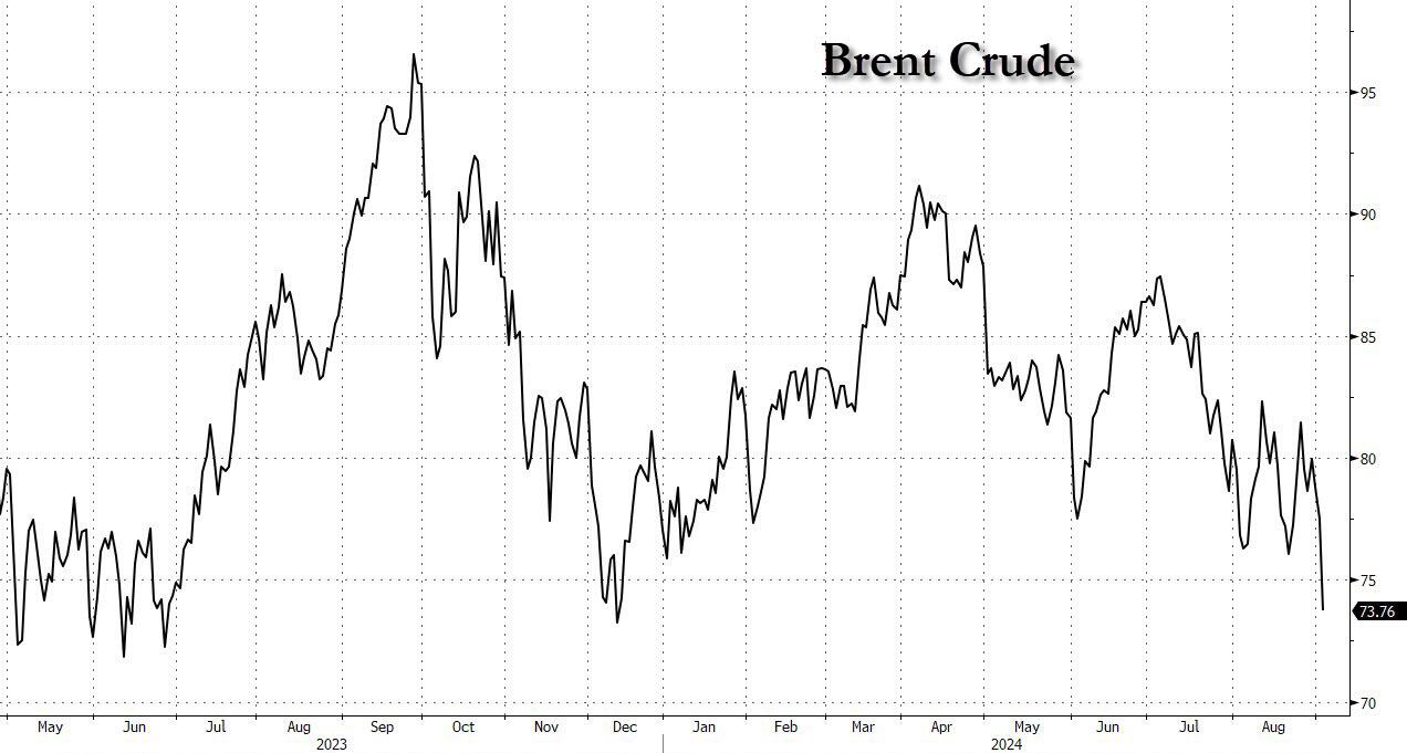 值得人们格外注意的是,周二的市场“大地震”显然并不局限于股票:大宗商品也受到了打击——布伦特油价盘中一度暴跌近5%,跌回74美元以下,抹去了2024年以来的所有涨幅,而WTI原油则逼近了70美元/桶......