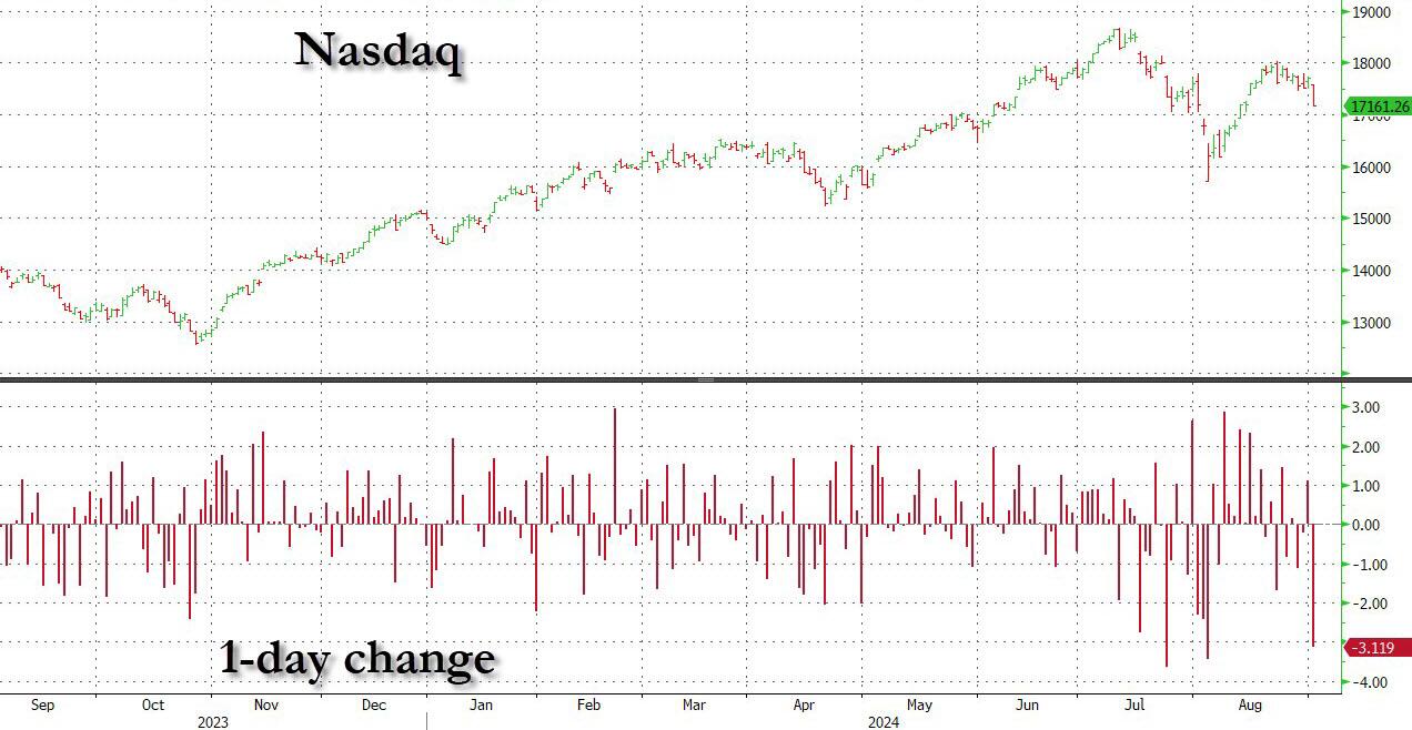 相比于标普500指数,周二市场上的更大的输家无疑是以科技股为主的纳指。纳指周二重挫577.33点,跌幅高达3.26%,收报17136.30点。这同样是纳指自8月5日以来的最大跌幅,也是过去一年中的第三大单日跌幅......