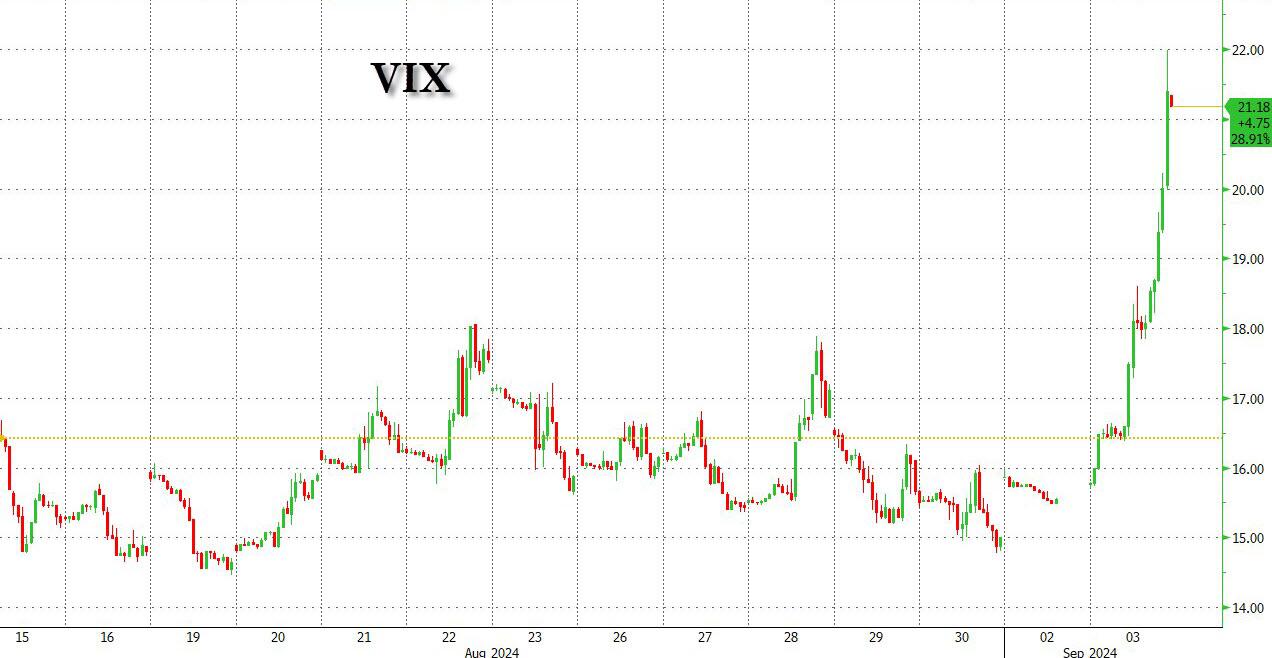 素有“恐慌指数”之称的VIX指数在周二飙涨33.2%,至20.72,创下8月初以来最大单日涨幅和最高收盘水平。虽然此番“恐慌指数”的涨幅并不如上月“黑色星期一”那天那般惊人(当时一度飙升至65上方),但时隔仅仅数周的再度异动,无疑让不少波动率空头在距上次不到一个月的时间里又遭遇了一轮巨额的保证金追缴。