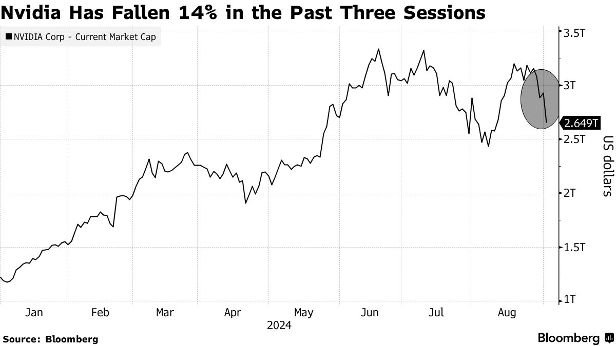 截至周二美股收盘,英伟达股价暴跌9.53%,单日抹去高达2789亿美元市值,创下美国股票有史以来最大规模的单日市值损失。自其公布仍然强劲增长的业绩数据,以及业绩展望未能达到市场最高预期以来,该股在三个交易日大幅下跌约14%,足以见得英伟达稳健的业绩数据不足以缓解市场对于AI盈利前景的悲观预期。