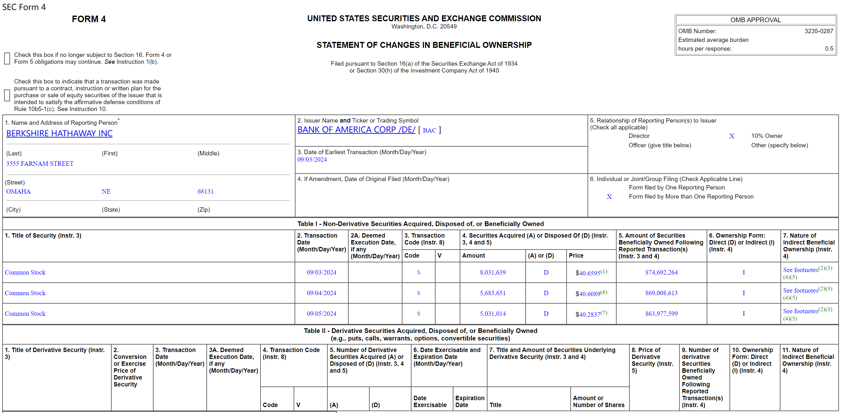 根据最新提交给SEC的一份新文件,伯克希尔哈撒韦于2024年9月3日、4日、5日连续三个交易日减持美国银行股票,合计1874.6万股,套现约7.6亿美元。美国银行是伯克希尔哈撒韦的第三大持仓。