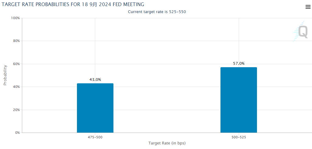 根据芝商所的美联储观察工具显示,目前利率期货交易员预计美联储在9月降息50个基点的概率约为43%,降息25个基点的概率约为57%,仍处模棱两可之间。