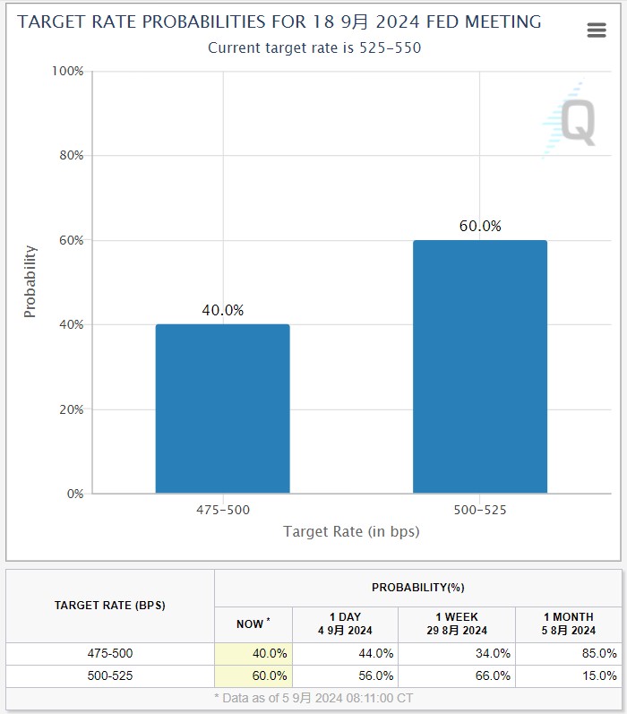 根据CME FedWatch工具,交易员目前预计,美联储会将联邦基金利率目标区间从目前的5.25-5.50%下调50个基点至4.75-5%的概率为40%,降息25个基点至5-5.25%区间的概率约为60%。