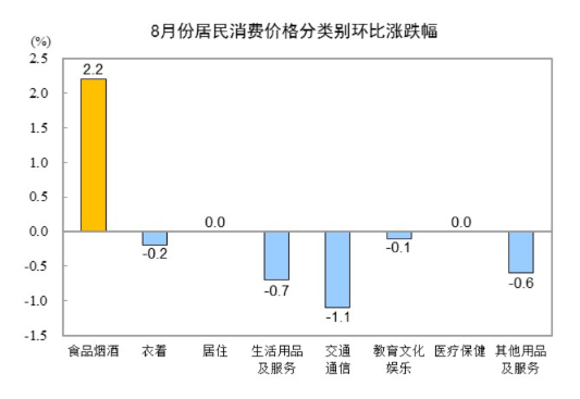 8月份,食品烟酒类价格环比上涨2.2%,影响CPI上涨约0.61个百分点。食品中,鲜菜价格上涨18.1%,影响CPI上涨约0.38个百分点;鲜果价格上涨3.8%,影响CPI上涨约0.08个百分点;畜肉类价格上涨3.6%,影响CPI上涨约0.11个百分点,其中猪肉价格上涨7.3%,影响CPI上涨约0.10个百分点;蛋类价格上涨2.8%,影响CPI上涨约0.02个百分点。