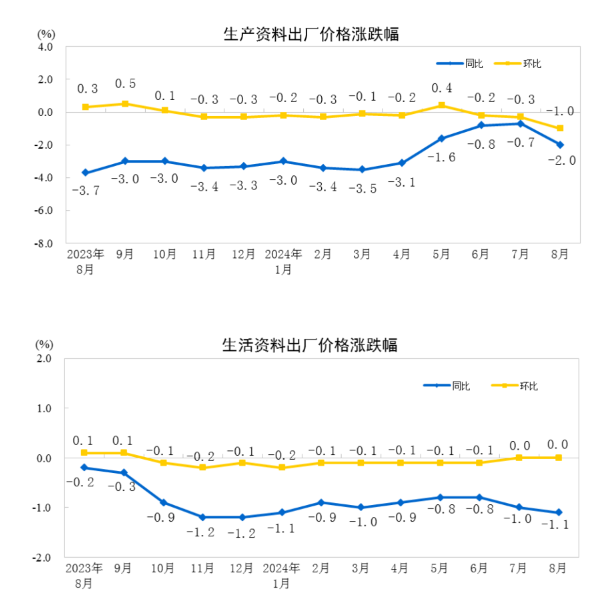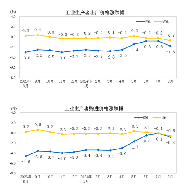 2024年8月份,全国工业生产者出厂价格同比下降1.8%,环比下降0.7%;工业生产者购进价格同比下降0.8%,环比下降0.6%。1—8月平均,工业生产者出厂价格比上年同期下降1.9%,工业生产者购进价格下降2.1%。