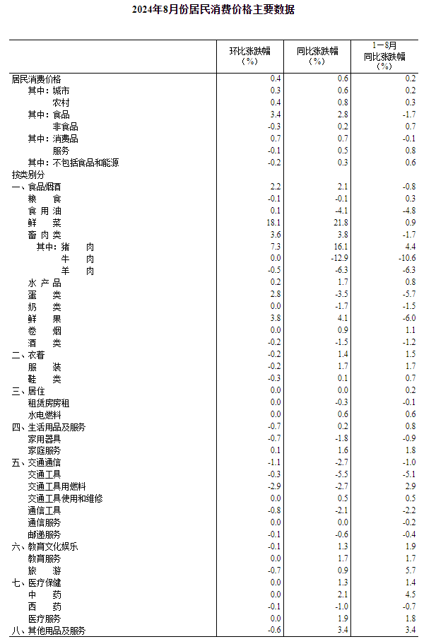 2024年8月份,全国居民消费价格同比上涨0.6%。其中,城市上涨0.6%,农村上涨0.8%;食品价格上涨2.8%,非食品价格上涨0.2%;消费品价格上涨0.7%,服务价格上涨0.5%。1—8月平均,全国居民消费价格比上年同期上涨0.2%。