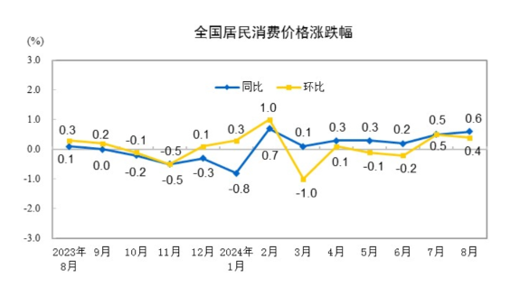 2024年8月份居民消费价格同比上涨0.6%