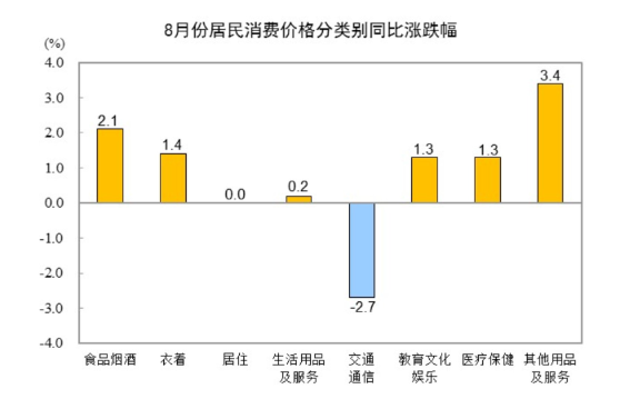 居民消费价格统计调查涵盖全国城乡居民生活消费的食品烟酒、衣着、居住、生活用品及服务、交通通信、教育文化娱乐、医疗保健、其他用品及服务等8大类、268个基本分类的商品与服务价格。