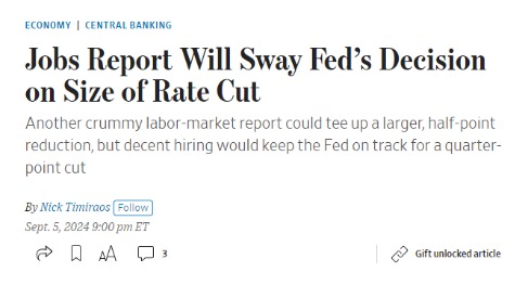 而与此同时,从时间点看,今晚这个非农夜,对于在决定美联储本月晚些时候降息幅度方面,也几乎已注定将扮演超乎寻常的关键角色。就连素有“新美联储通讯社”之称的美联储喉舌记者Nick Timiraos,在北京时间日内早间也以《8月就业报告将左右美联储9月降息幅度》为题,强调了今晚这份数据的重要性。