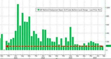 最新的坏消息来自周四,就业数据处理公司ADP公布的“小非农”ADP数据显示,8月份私营部门就业增长仅为9.9万人,为2021年1月以来的最小增幅。