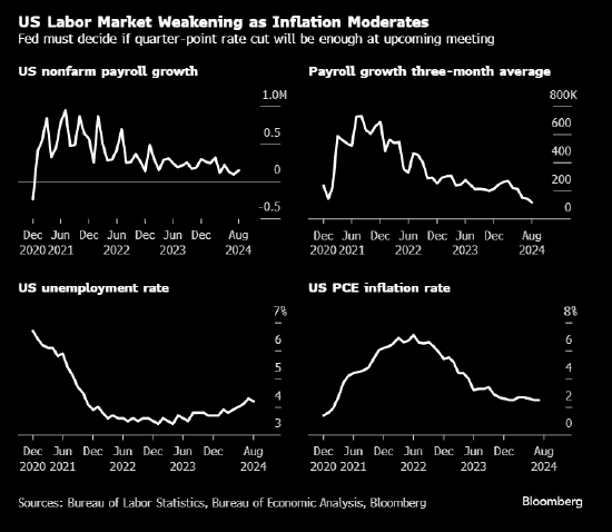 周五发布的月度就业报告显示,过去三个月美国的招聘步伐放缓至2020年疫情爆发以来的最低水平。即便如此,这些数据仍让投资者怀疑,美联储官员是否会在9月17-18日会议上大幅降息。