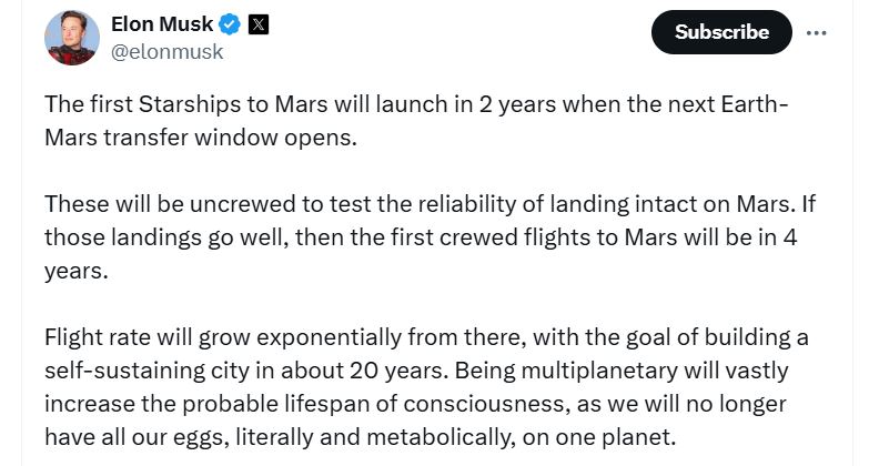马斯克写道,这些飞船将是无人驾驶的,以测试在火星上完整着陆的可靠性。他补充称,如果它们顺利着陆,那么SpaceX将在四年内首次向火星发射载人飞船,这将是一个关键节点,因为自那时起飞船的发射率将呈指数级增长。