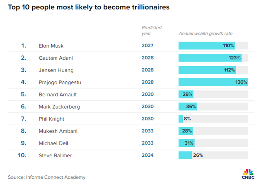 紧随其后的是英伟达首席执行官黄仁勋和印度能源矿业大亨Prajogo Pangestu,这两人也可能在2028年成为万亿富翁。