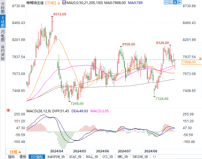 在中国市场,近期的棕榈油进口利润为-385.57元/吨,较上个交易日减少了81.50元/吨。尽管当前进口利润为负,但理论上,若亏损严重,可能会减少进口量,从而推升价格。国内棕榈油走势受到马棕油价格走弱的影响,市场等待MPOB报告的指引。此外,菜系市场的变动也对棕榈油价格产生了影响。商务部宣布自9月9日起对加拿大原产的油菜籽进行反倾销立案调查,利好消息推动了菜粕菜油盘面的上涨,而棕榈油走势则相对偏弱。