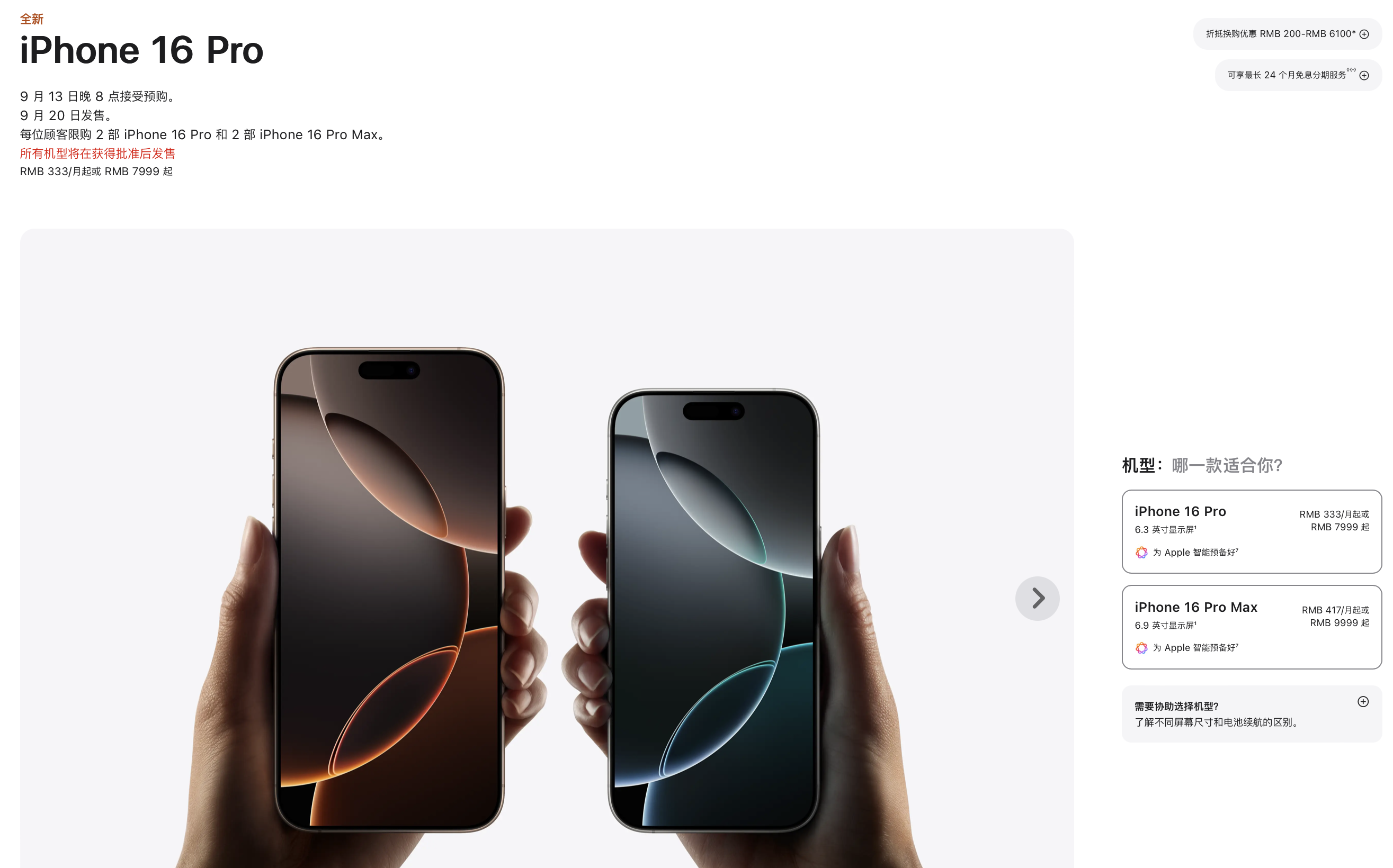 iPhone 16 Pro及iPhone 16 Pro Max,两款机型将分别配备6.3和6.9英寸的屏幕,搭载性能更强的A18 Pro芯片。iPhone 16 Pro起售价为999美元,iPhone 16 Pro Max起售价为1199美元。