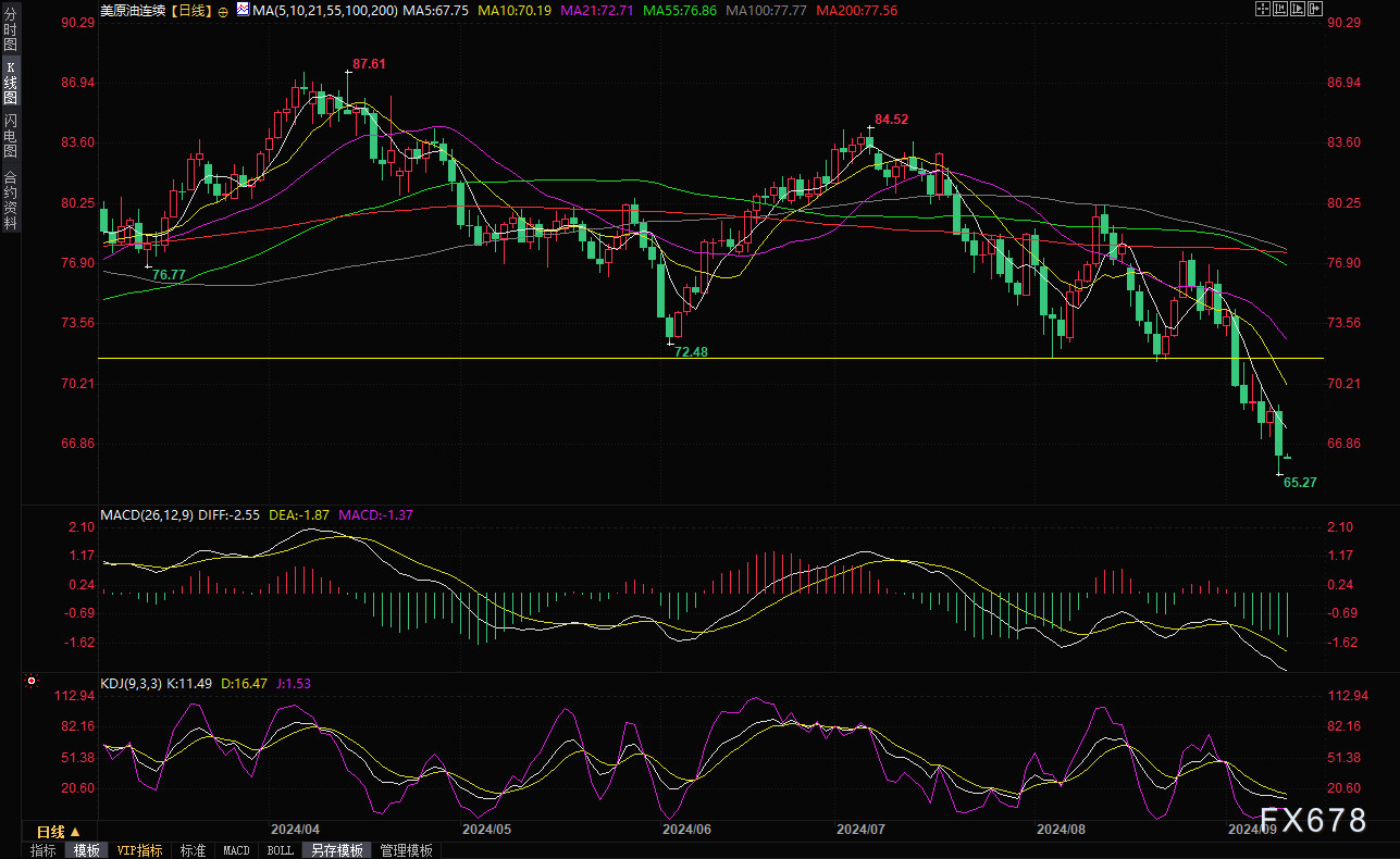 周三(9月11日)亚市早盘,国际油价维持弱势,在欲一年低位徘徊,美原油目前交投于66.19美元/桶附近,布伦特原油目前交投于69.57美元/桶附近。布伦特原油期货周二收于2021年12月以来的最低水平,此前OPEC+下调了今年和2025年的需求预测,盖过了热带风暴弗朗辛造成供应担忧的影响。 布伦特原油期货周二收跌2.65美元,或3.69%,结算价报每桶69.19美元。美国原油期货周二收跌2.96美元,跌幅4.31%,结算价报每桶65.75美元。