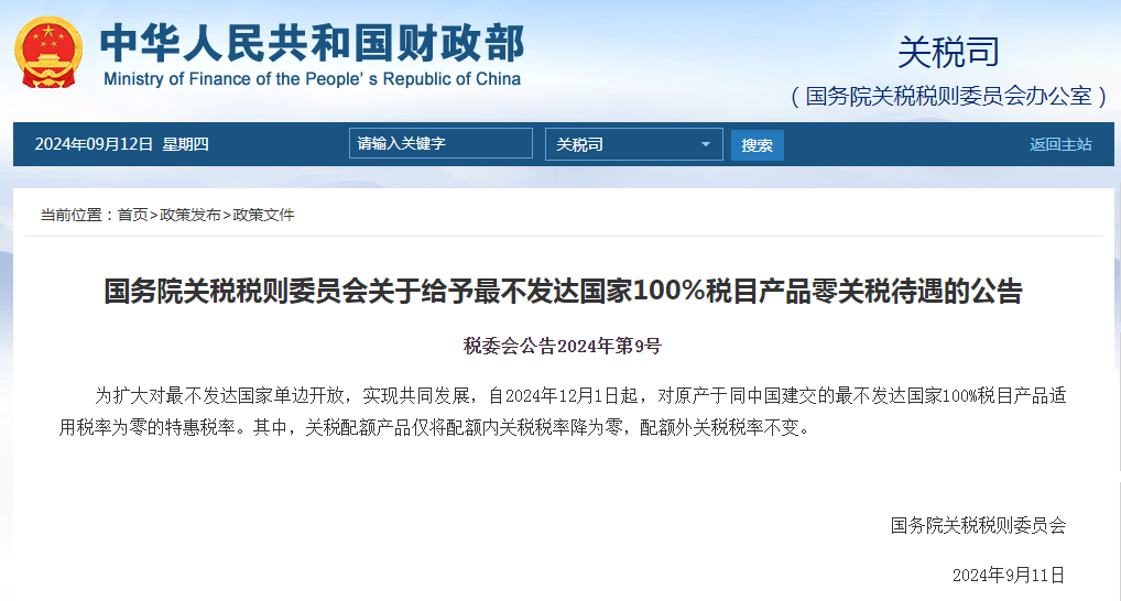 为扩大对最不发达国家单边开放,实现共同发展,自2024年12月1日起,对原产于同中国建交的最不发达国家100%税目产品适用税率为零的特惠税率。其中,关税配额产品仅将配额内关税税率降为零,配额外关税税率不变。