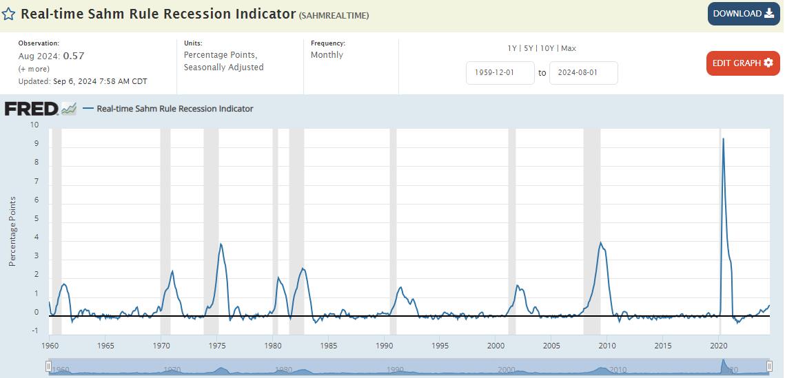 上月,在非农数据显示美国7月份失业率达到4.3%之后,“萨姆规则”便迈过了上述0.5个百分点的门槛。而尽管本月初的数据显示美国8月失业率回落到了4.2%,但由于对比基数抬升,“萨姆规则”显示的差值反而进一步上升至了0.57个百分点。