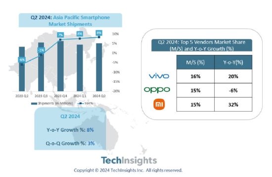 TechInsights的数据指出,2024年Q2,亚太地区智能手机市场同比增长8%,与同期全球智能手机市场的增长率保持一致。