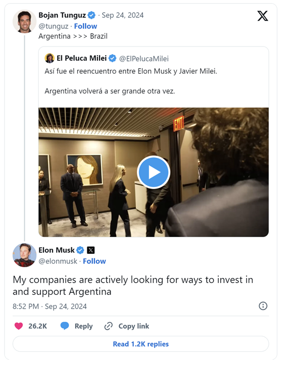 米莱和马斯克会面的视频在网上被广泛分享并热议,一些社交媒体用户认为阿根廷比其他南美国家更好。马斯克回应了其中一条帖子,称他的公司实际上正在寻找支持阿根廷的方式。