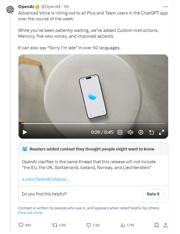 今年5月,OpenAI首次展示了这款语音产品,并展示了它如何快速响应用户发出的书面和视觉提示。但在6月,以解决潜在安全问题为由,推迟发布。到了7月份,该功能也只面向有限数量的ChatGPT Plus用户开放。