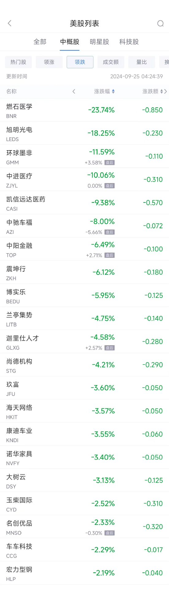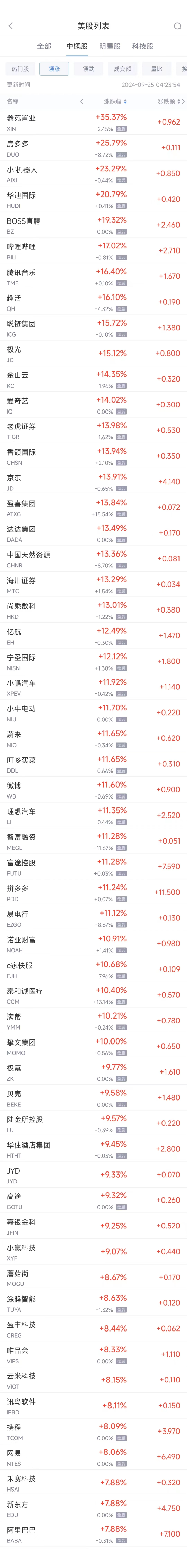 上涨股当中(按市值降序排列),台积电涨4.13%,阿里巴巴涨7.88%,拼多多涨11.24%,网易涨8.06%,京东涨13.91%,携程涨8.09%,百度涨7.40%,中华电信涨1.03%,理想汽车涨11.35%,日月光半导体涨1.20%,联电涨0.82%,百济神州涨3.97%,贝壳涨9.58%,中通涨6.56%,腾讯音乐涨16.40%,蔚来涨11.47%,新东方涨7.88%,华住酒店集团涨9.45%,富途控股涨11.28%,小鹏汽车涨11.92%,满帮涨10.21%,唯品会涨8.33%,哔哩哔哩涨17.02%,WSP控股涨1.13%,BOSS直聘涨19.32%。