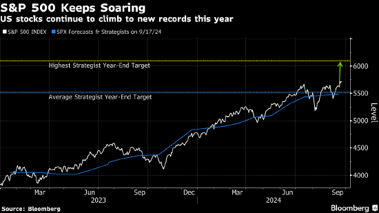 在美联储上周大幅降息之后,包括高盛集团和BMO Capital Markets的股票观察人士在内都在讨论2024年达到这一水平的可能性。Evercore ISI的Julian Emanuel是今夏第一个将这个数字作为自己正式目标者。