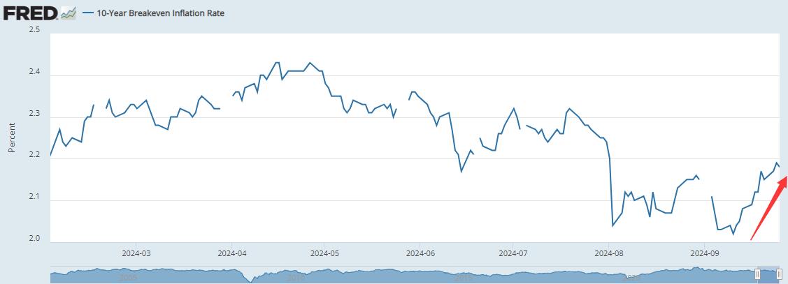 在美联储上周三宣布降息后,以美国国债通胀保值债券 (TIPS)衡量的未来十年通胀预期明显上升。截止本周三,10年期盈亏平衡通胀率已回升至了2.18%,为8月初以来的最高水平。