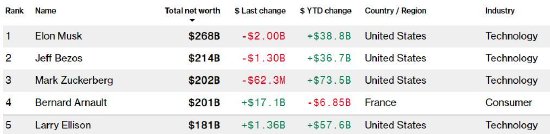 阿尔诺在全球富豪榜上的排名也从第五升至第四位。今年3月,他的财富一度达到2310亿美元的峰值,成为世界首富。