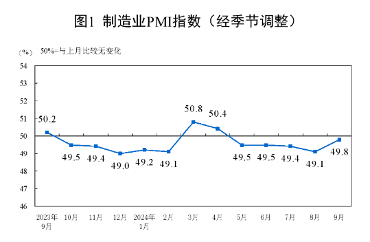 9月份,制造业采购经理指数(PMI)为49.8%,比上月上升0.7个百分点,制造业景气度回升。