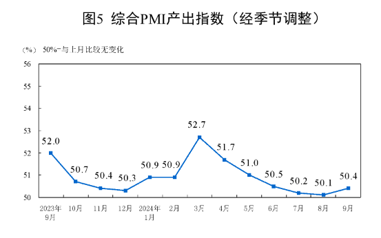 9月份,综合PMI产出指数为50.4%,比上月上升0.3个百分点,表明我国企业生产经营活动总体扩张有所加快。