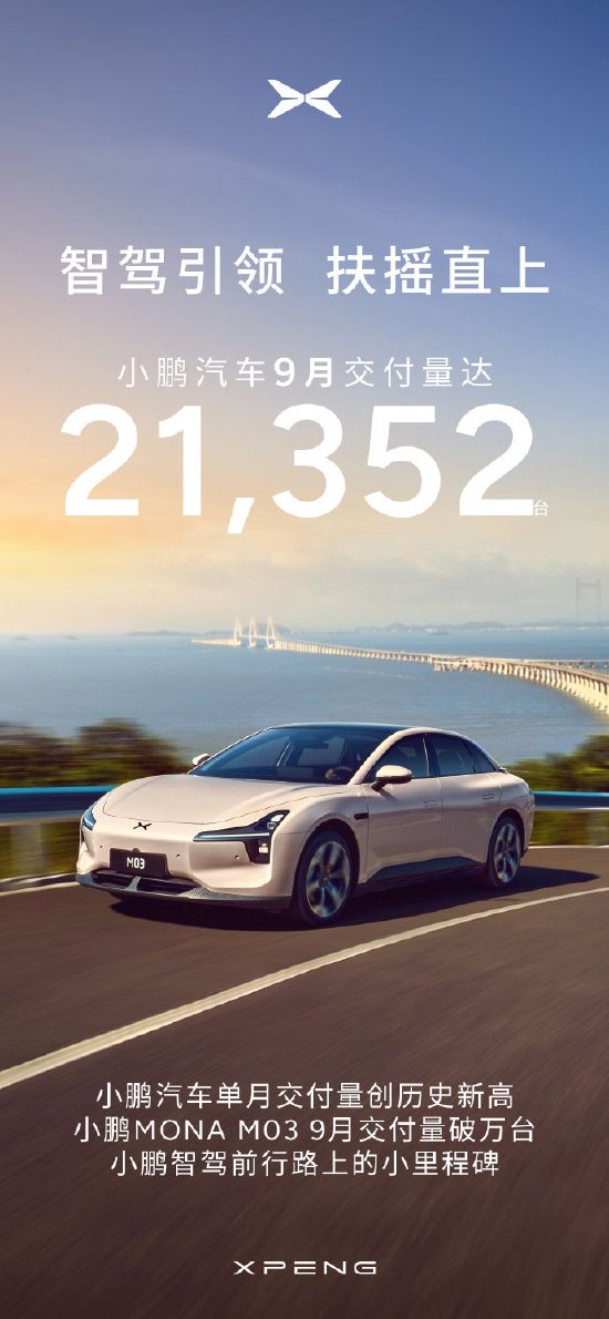 今日,小鹏汽车公布最新交付成绩,创单月交付历史新高。 2024年9月,小鹏汽车共交付新车21,352台,同比增长39%,环比增长52%。其中,小鹏MONA M03交付破万台。2024年1月-9月,小鹏汽车累计交付新车共98,561台,同比增长21%。