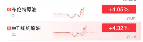 受这一消息影响,石油价格跳涨4%。WTI原油突破71美元/桶,日内大涨4%;布伦特原油日内涨4%,报74美元/桶。