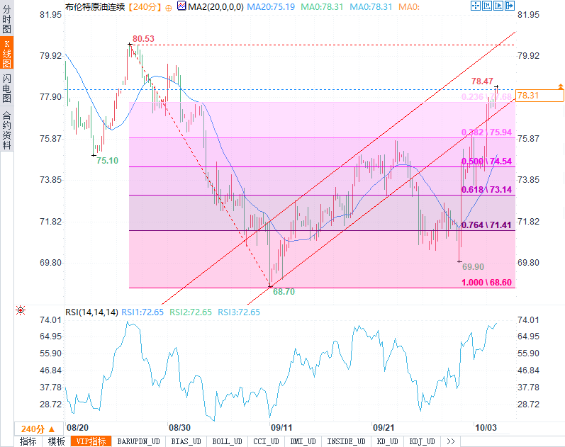 周五(10月4日),国际油价在早盘交易中保持平稳,市场处于观望态势。尽管中东地区紧张局势加剧和全球石油供应充足的前景对油价构成了不同的影响,油市整体波动不大。北京时间16:51,布伦特原油连续合约报78.27美元/桶,涨0.70美元;美原油连续合约报74.33美元/桶,涨0.63美元。两种原油在本周均录得8%左右的周涨幅。市场正面临供需面的拉锯,而今晚将发布的9月美国非农就业数据,可能为油价走势带来新的动能。