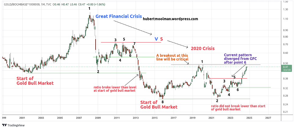 金融危机期间,该比率在点7就失效了,无法超过点3和点5,最终创下历史新低。美元贬值到极点,但人们对该体系的信心仍然保持。换句话说,金价仍然受到抑制。