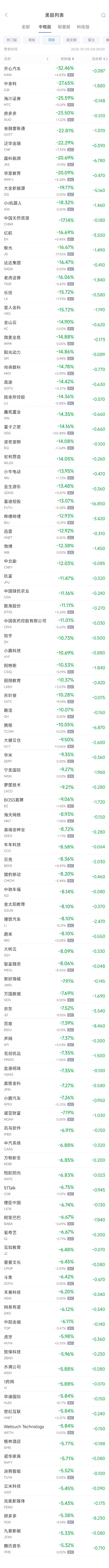 领跌中概股列表: