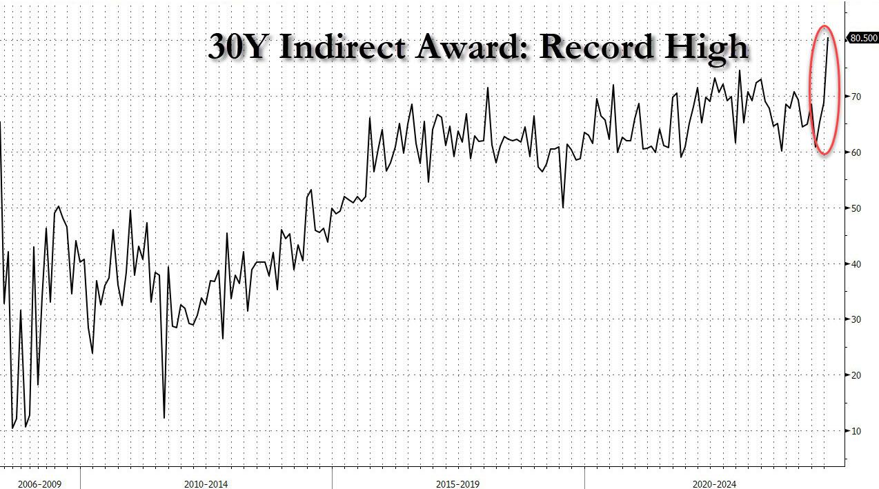 作为衡量海外需求的指标,通常由外国央行等机构通过一级交易商或经纪商参与竞标的间接竞标者(Indirect Bidders)获配比例高达惊人的80.5%,较上个月的68.7%飙升,创历史最高。