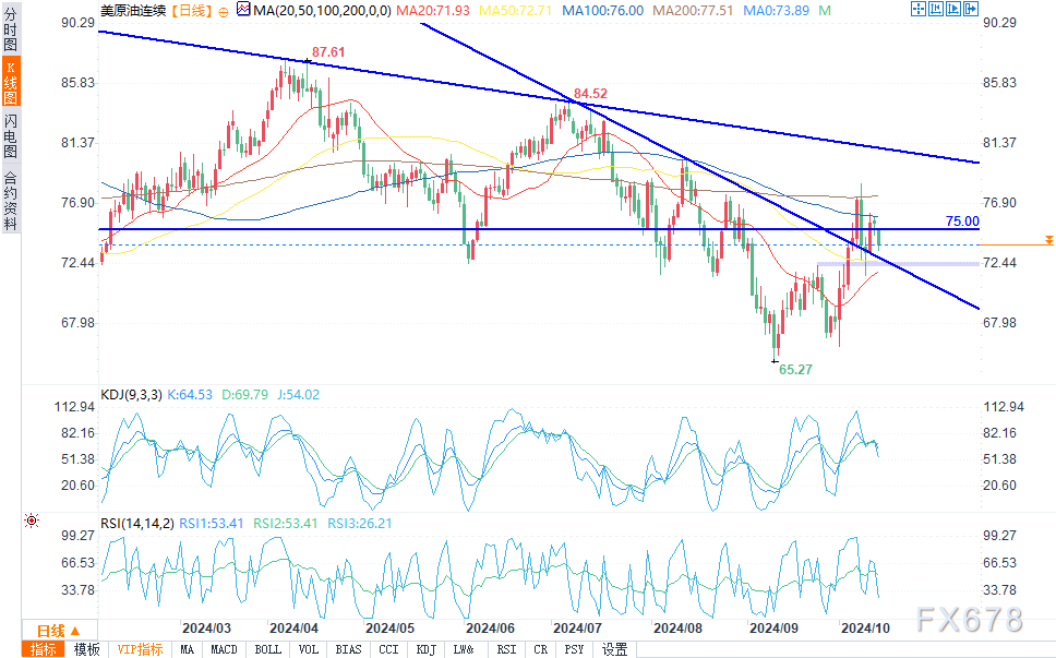 周一(10月14日)欧盘时段,对需求前景的担忧日益加剧,油价在连续两周上涨后开始走低。原油期货价格进一步跌向50日移动均线72.70美元。不过,油价反弹可能推动油价回到上周78.46美元的高位。