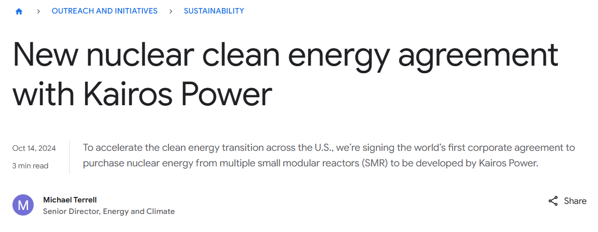 通过这笔交易,谷歌加入了微软和亚马逊的行列,这些大型科技公司都在寻求利用核能来填满自家对电力的高需求。