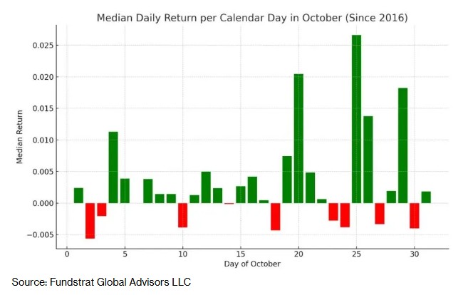 数据显示,比特币在10月开局表现不佳,而在过去10年里,比特币在10月的平均涨幅为20%。Fundstrat Global Advisors LLC数字资产策略主管Sean Farrell表示:“历史数据表明,10月份加密货币市场的季节性强势通常集中在当月的下半月。”
