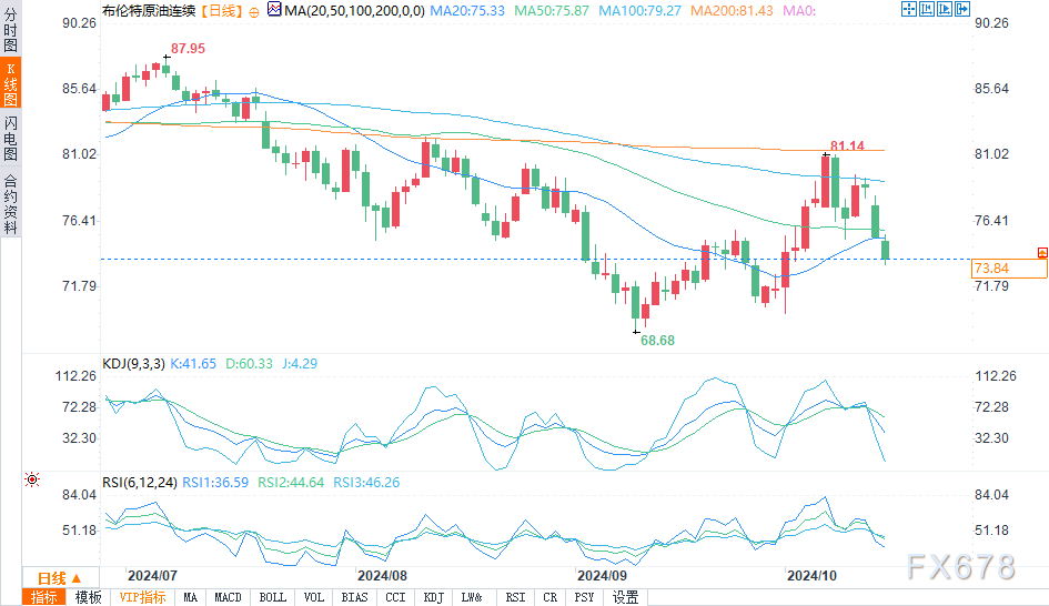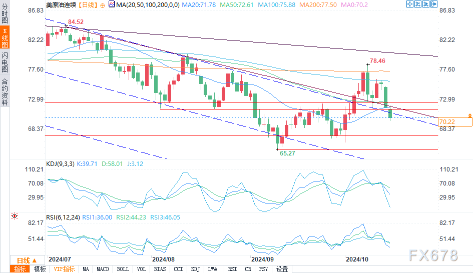 (布伦特原油日图 来源:易汇通) 布伦特原油市场看起来类似。70美元的水平是需要关注的市场底部水平。如果价格从这么反弹,80美元的水平将很难突破。 布伦特原油可能在底部70美元和顶部80美元之间交易。 北京时间22:42,WTI原油期货报70.07美元每桶,跌幅5.09%。布伦特原油报73.71美元每桶,跌幅2.21%。